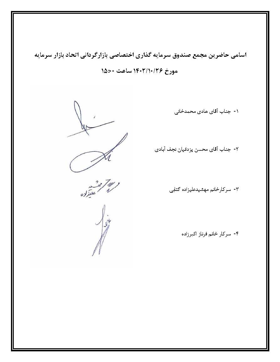 اسامی حاضرین مجمع تمدید صندوق اتحاد بازار سرمایه مورخ ۱۴۰۳۱۱۲۴ ساعت ۱۰